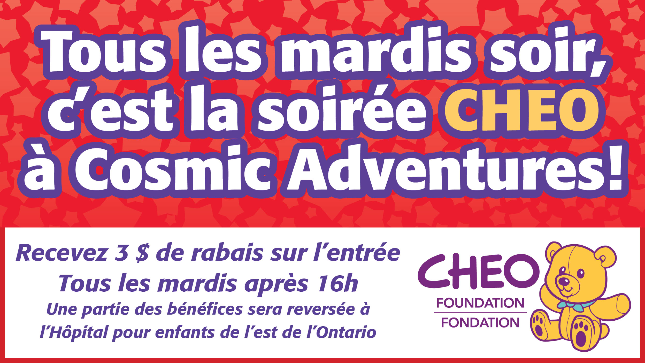 Cosmic Adventures, l’aire de jeux intérieure la plus grande et la plus sécuritaire d’Ottawa, invite les enfants de 0 à 12 ans à ramper, sauter, glisser et explorer un environnement propre et sécuritaire. Notre aire de jeux de plusieurs étages sur plus de 20 000 pi. ca. est l’endroit tout indiqué pour des jeux à n'en plus finir, des anniversaires tout compris, les groupes et les camps de jour. Cette entreprise familiale a été mise sur pied avec les petits à l’esprit, grâce à l’inclusion de zones sécuritaires pour les toutpetits, des menus sains et des jeux d’adresse non compétitifs.